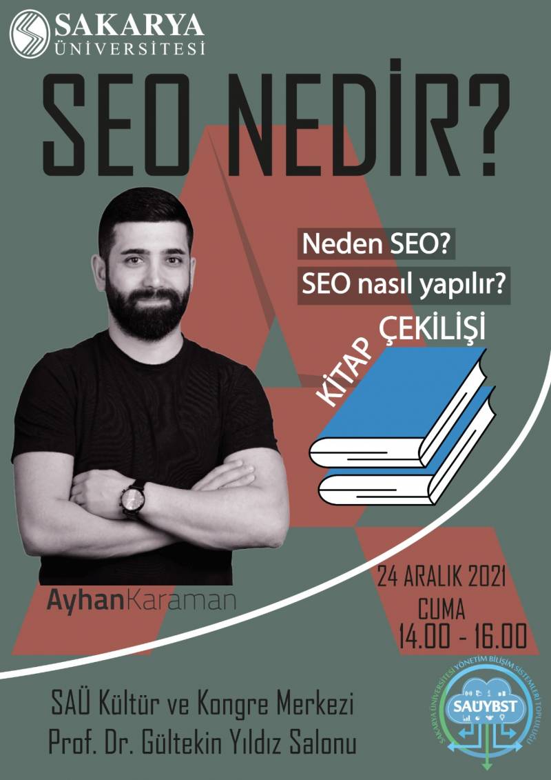 Bölümümüz öğrenci topluluğunun SEO Nedir? etkinliği 24 Aralık Cuma 14:00 - 16:00 saatleri arasında SAÜ Kültür ve Kongre Merkezi, Prof. Dr. Gültekin Yıldız Salonu'nda gerçekleştirilecektir.