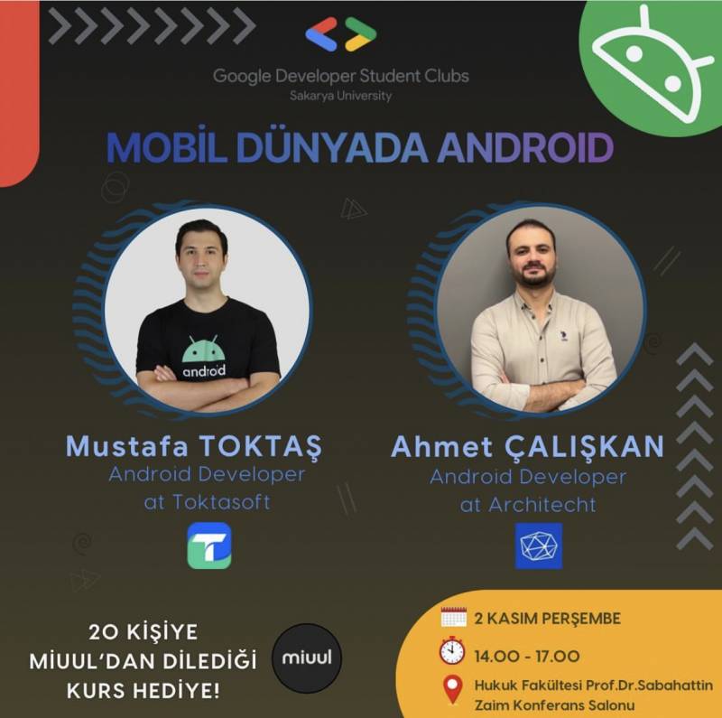 Etkinliğe Toktasoft şirketinden Android Geliştiricisi Mustafa Toktaş ve Architect şirketinden Android Geliştiricisi Ahmet Çalışkan katılım sağlayacak.
